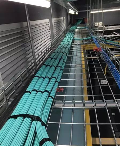 如圖所示,橋架內光纖和網線分開整齊布放,每隔一段距離用扎帶捆綁,保持美觀。