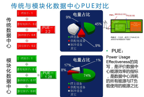 從上圖可以看出,傳統(tǒng)數(shù)據(jù)中心所采用的精密空調(diào)制冷,制冷部分耗電量占比很高,是數(shù)據(jù)中心能耗損耗的最大源頭。而采用模塊化機(jī)房后,制冷部分耗電量占比大幅降低,整體PUE可達(dá)1.5。