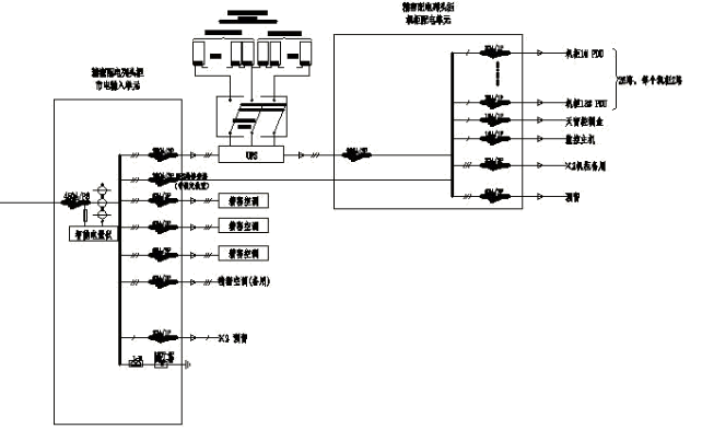 機(jī)房的動(dòng)力設(shè)備如精密空調(diào)、新風(fēng)換氣機(jī)由市電供電,其它計(jì)算機(jī)設(shè)備如服務(wù)器、交換機(jī)等由UPS進(jìn)行供電。